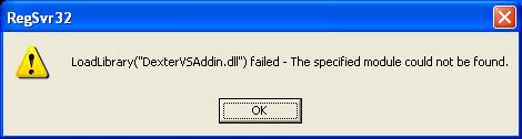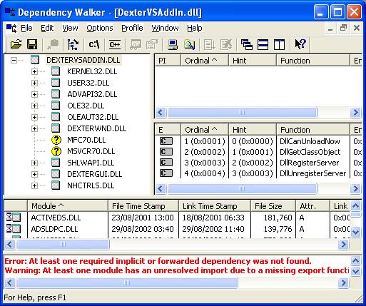 How do I resolve this error? A. Dexter is built using Visual Studio .NET 7.0, and requires 2 Microsoft DLLs (mfc70.dll and msvcr70.dll) which may not be installed on your system. You can verify these DLLs are missing by opening the file DexterVSAddIn.dll in the Dependency Walker (Depends.exe, available here). You will see something similar to the following screenshot: