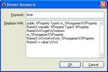 If you enter 'int', 'i' and 'Age' in the edit boxes as shown and click <OK>, Dexter will automatically produce the following code (implementing a standard C# property).